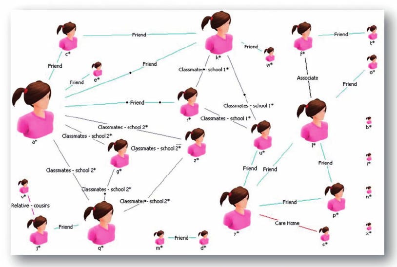 i2 has been used extensively to pattern child sex trafficking networks. The image below was titled “Operation X Victim Network” in a paper titled “Exploring Internal Child Sex Trafficking Networks Using Social Network Analysis,” 2011.